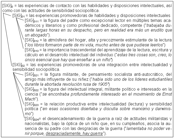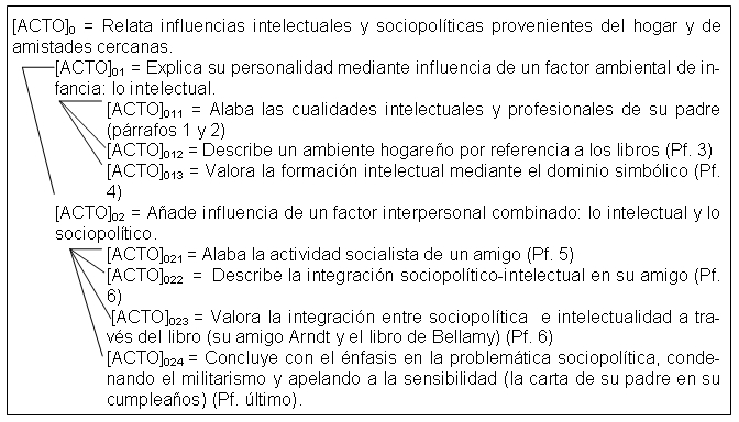 Yendo ahora al examen de los actos más frecuentes del texto, hay algo muy curioso, que vale la pena destacar: bajo el macro-acto que podríamos sintetizar con el verbo ‘autobiografiar’ (i. e.: relatar las propias experiencias), la mayoría de los meso-actos consisten en ‘biografiar’ (i. e.: relatar las experiencias de otro). Es como si rehuyera hablar de sí mismo para hablar de otros o, de otro modo, como si hablara de sí mismo indirectamente, utilizando las coincidencias y semejanzas con otros o como si quisiera explicar sus propias actitudes mediante el influjo de las actitudes de otros. Obsérvese que de los 7 meso-actos del esquema, 4 consisten en ‘biografiar’ (actos 011, 021, 022, 023), sin tomar en cuenta muchos micro-actos (que no aparecen en el esquema y que esperamos que el lector formule) en que ocurre lo mismo: véanse, por ejemplo, las referencias a Selma Kagerlöf, Helen Keller, Emma Goldberger, Ernst Mach, etc. Más datos que refuerzan esto aparecen en el análisis sintáctico (ver más adelante).