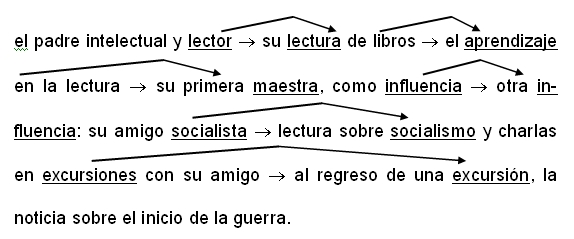 El enlace entre párrafos viene dado por correferencias sucesivas (de carácter semántico), que aparecen señaladas en el siguiente esquema, donde las palabras subrayadas funcionan como antecedentes y consecuentes de uno a otro párrafo:
